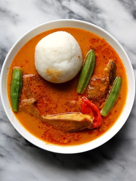 Delicious rice balls with palm nut soup side with chicken & tuna